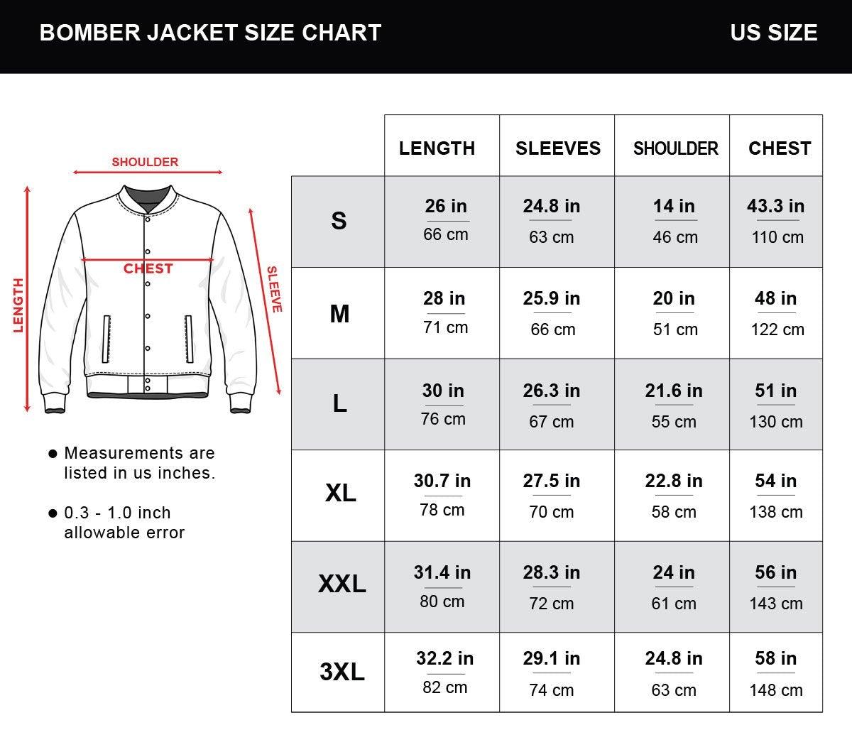 - Each Bomber Jacket is custom printed, cut, and sewn just for you ? there may be small differences in the design on the seams and/or arms due to the custom nature of the production process.